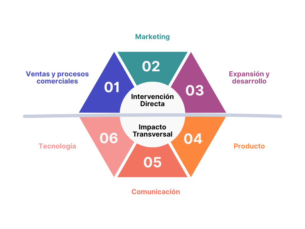 Intervenimos directamente sobre las áreas que impulsan tu captación y conversión, y al mismo tiempo impactamos de forma transversal en los elementos estratégicos y operativos que hacen que todo funcione y escale.